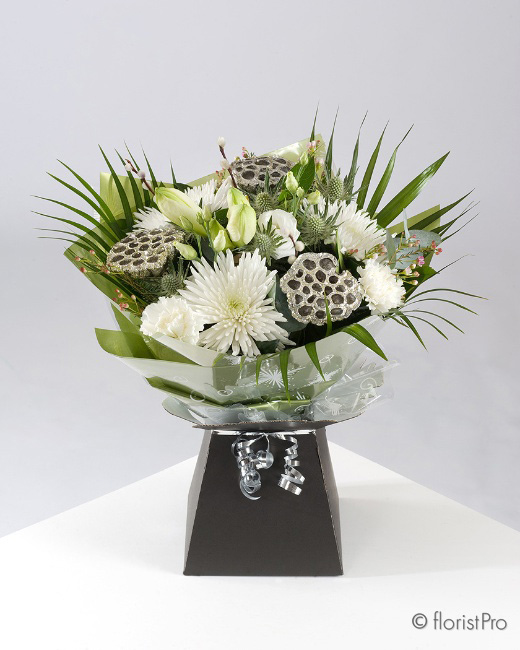 Winter whites and silver glitter create a spectacular hand tied presented in a black gift box. Anastasia blooms, lotus heads, amaryllis, palm, hypericum and eucalyptus make this just perfect for that christmas gift.