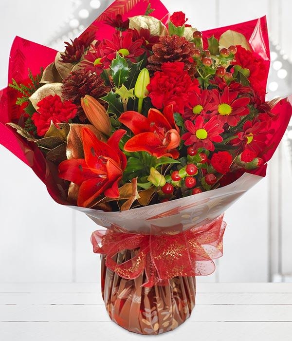 A festive collection of blooms come together to create this Berry & Bright bouquet, with deep red and glistening gold tones adding to the magic of Christmas.